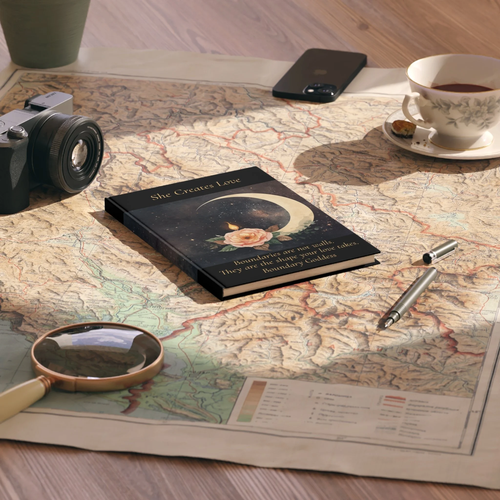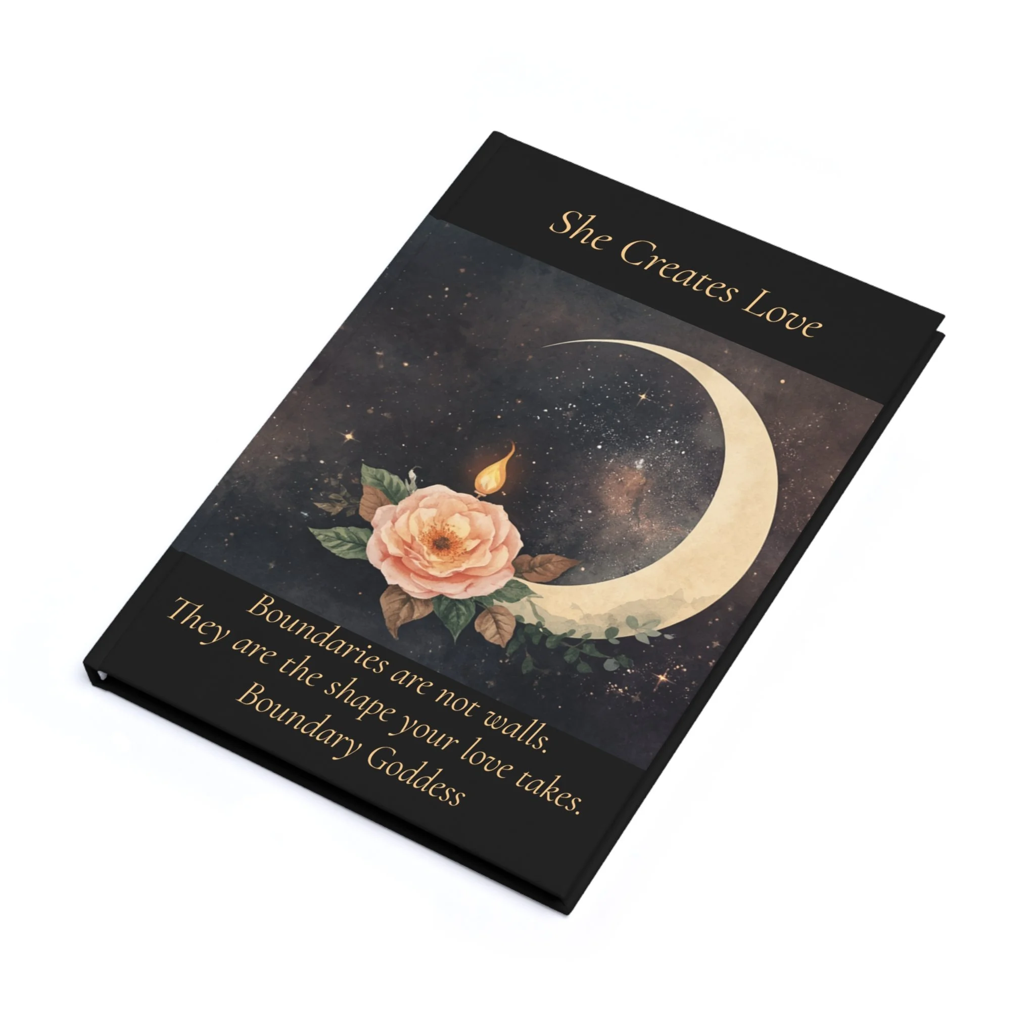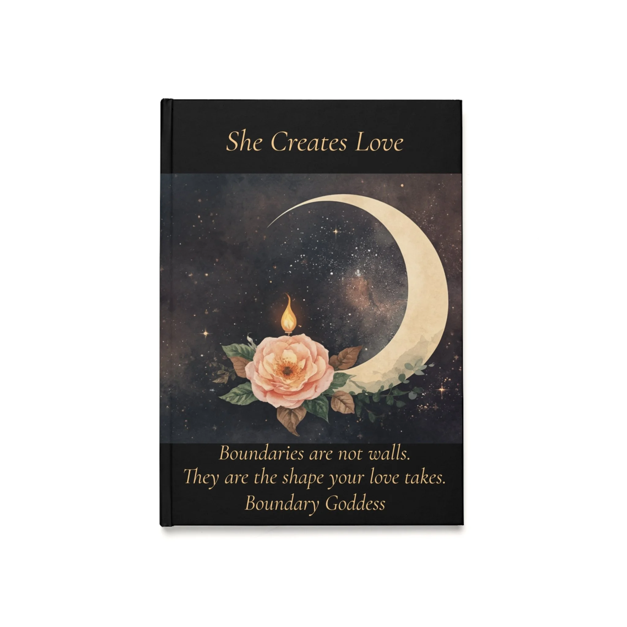 The cover carries the crescent moon, rose, and flame design from the She Creates Love brand — a quiet visual anchor for the work happening inside.